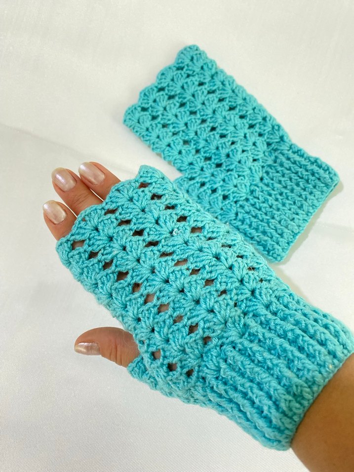 Turkuaz renkli, dantel detaylı örgü parmaksız eldivenler, rahat ve renkli bohem tarz sunar. Retro ve hippie görünüme uygundur.