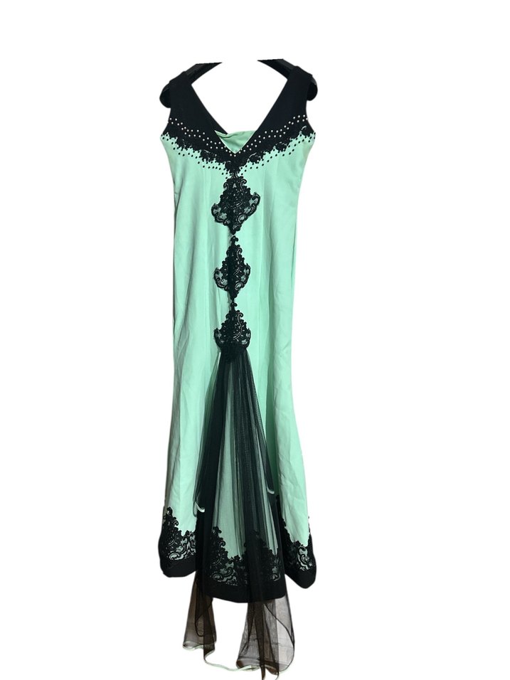 V yaka, kolsuz, dantel işlemeli siyah detaylarla süslenmiş turkuaz renkli, uzun ve vücuda oturan gotik kadın elbisesi. Düğünler için uygun.