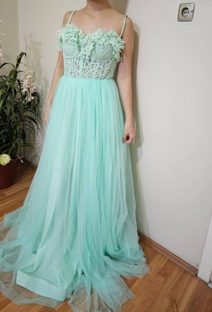 Turkuaz renkli, dantel detaylı ve ince askılı, uzun ve hafif akışkan kumaştan yapılmış nişan elbisesi.