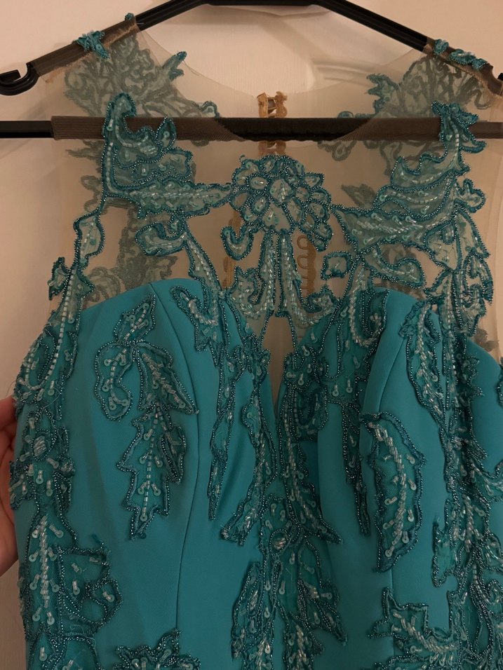 Bir defa giyildi. Turkuaz, kolsuz, V yaka, dantel ve işlemeli detaylara sahip, uzun ve vücuda oturan abiye elbise. Parlak ve bohem tarzda, düğünler için uygundur.