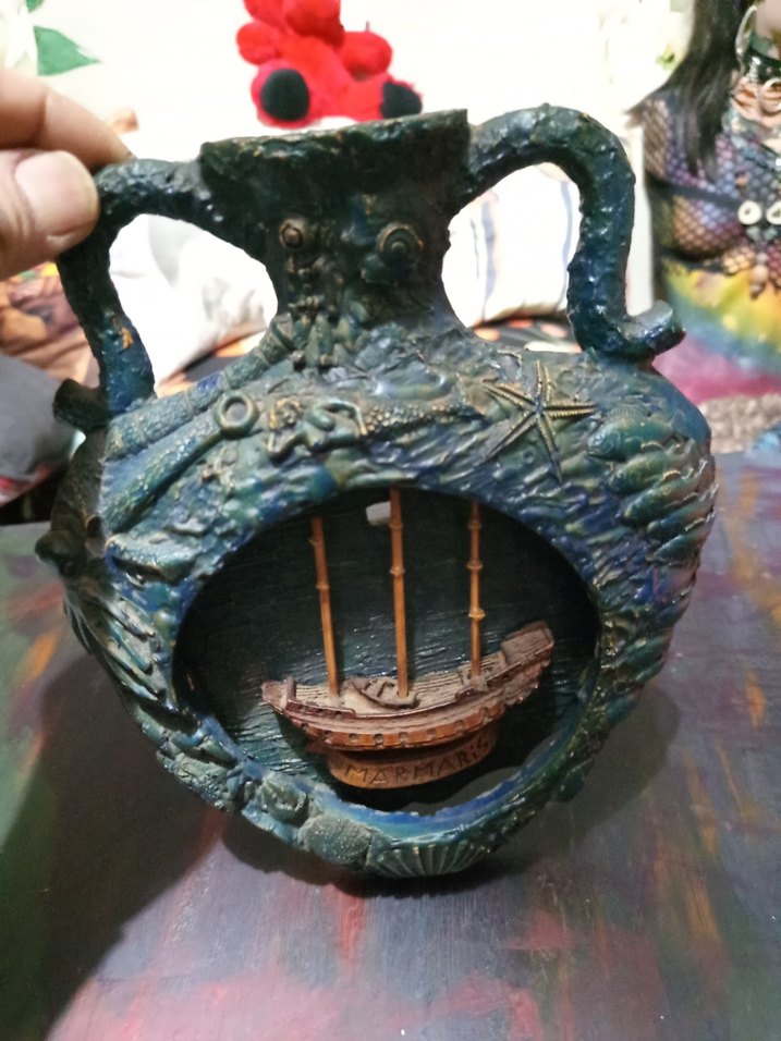 Bu koyu turkuaz figürin, içinde detaylı bir gemi bulunan deniz temalı dokulu bir çerçeveye sahiptir. Rustik ve sanatsal görünümlüdür. ⚓