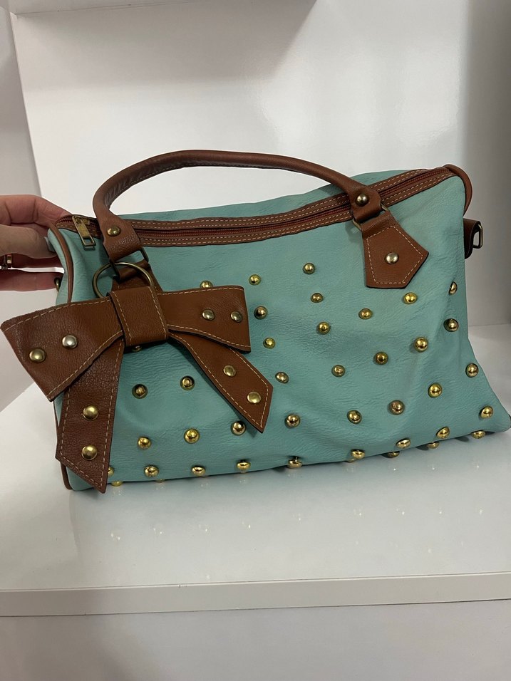 Turkuaz deri, tokalı ve altın renkli süslemelere sahip, bohem ve Paris retro tarzını yansıtan kadın çantası. Günlük kullanım için uygun.