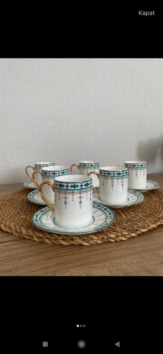 Altı adet kahve fincanı ve tabağından oluşan set, pastel turkuaz renk ve altın saplarla süslenmiş detaylı desenlere sahip. ☕