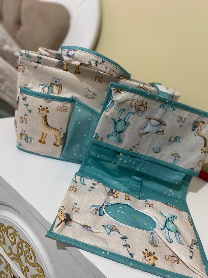 Turkuaz ve gri renklerde, hayvan desenli baskılı bebek çantası. Çoklu bölmeli ve katlanabilir alt değiştirme minderi içerir. Sıfırdır !
