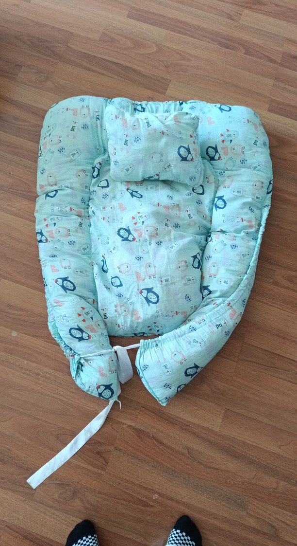 Turkuaz renkte, yumuşak dolgulu bebek uyku seti, pastel desenleriyle rahatlık ve destek sağlar.