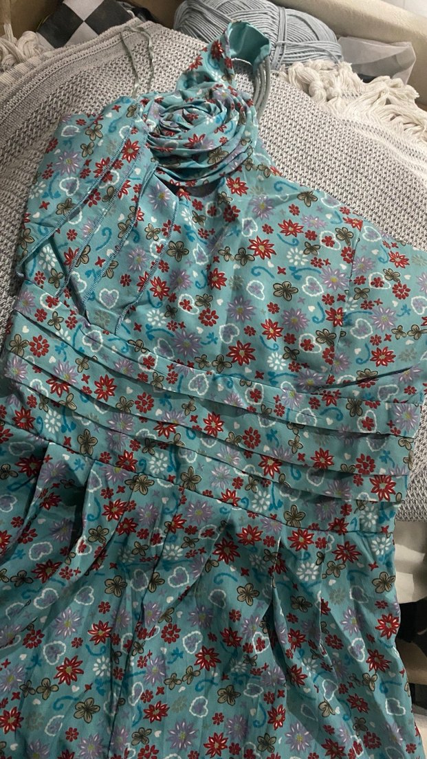 Bu dar kesim hamile tunik, askılı ve uzun boylu, yumuşak kumaştan yapılmıştır. Pastel turkuaz zemin üzerinde çiçek ve kalp desenleriyle bohem ve vintage tarzı yansıtır.