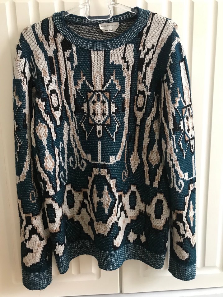 Bohem tarzda, turkuaz renkli, desenli örgü kumaştan yapılmış, yuvarlak yakalı, uzun kollu, bol kesim kadın kazak.