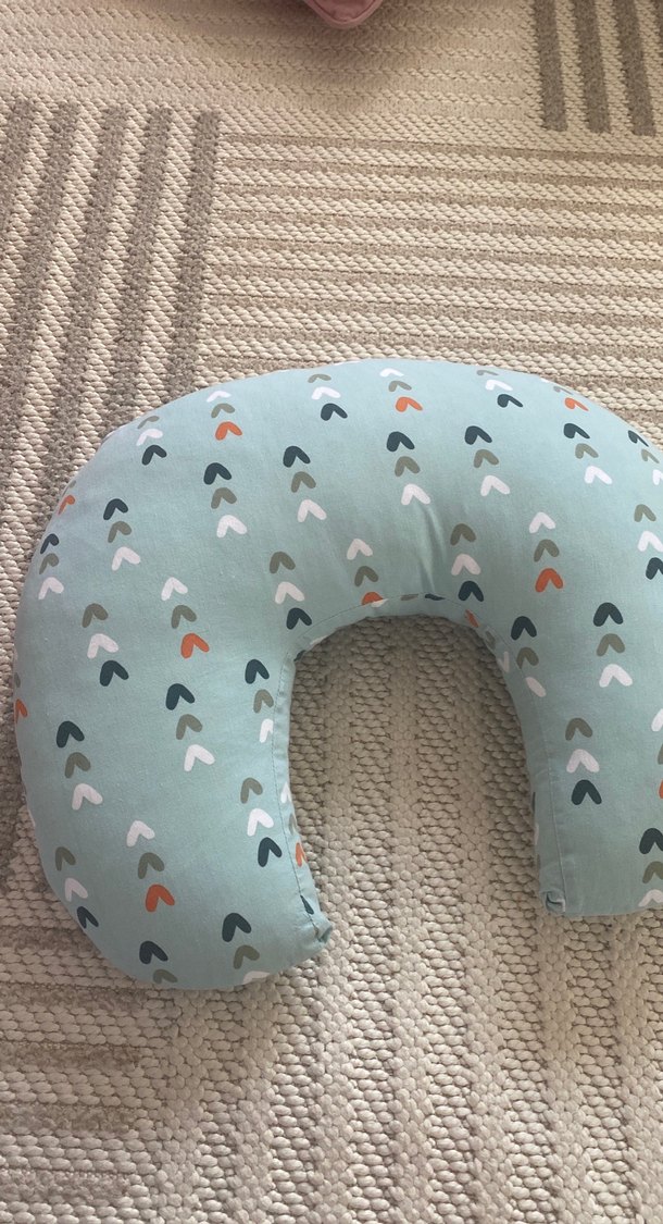 Turkuaz renkte, pastel renklerde küçük ok desenleriyle süslenmiş emzirme ve hamile yastığı, yumuşak kumaştan üretilmiştir ve U şekillidir. İki kılıf hediye