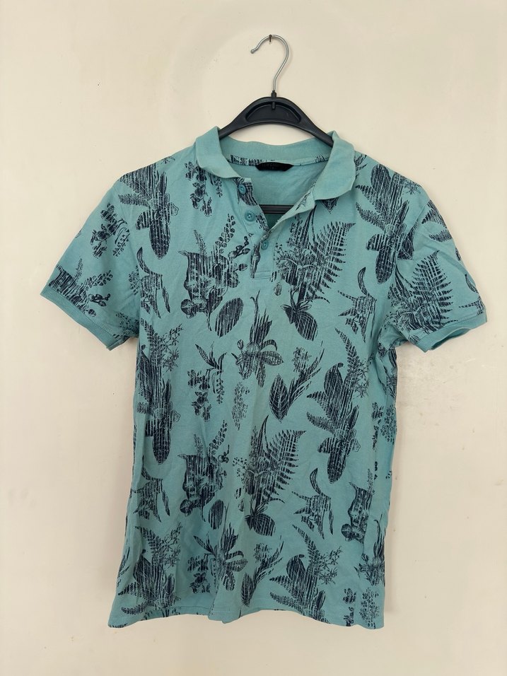 Turkuaz renkte, düğmeli yakalı ve kısa kollu erkek polo tişört. Baskılı deseni ve rahat kesimiyle günlük rahat kullanım için uygundur.