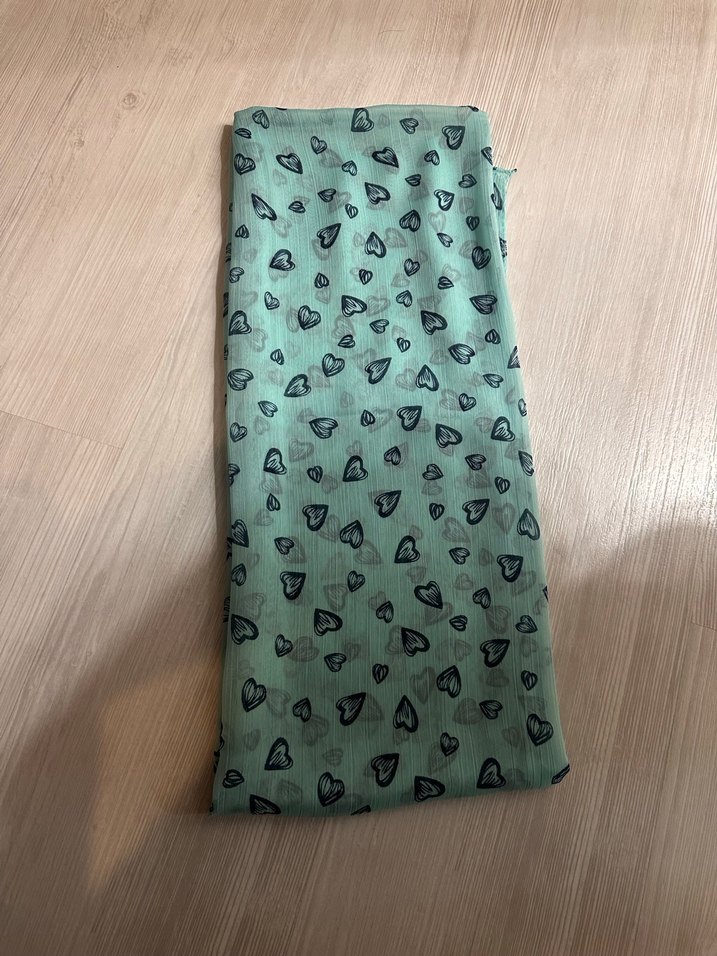 Turkuaz renkte, gri kalp desenli, yumuşak sentetik kumaştan yapılmış, bohem tarzda kadın şalıdır.