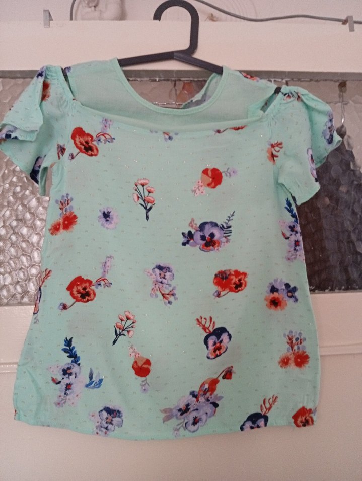Turkuaz renkli, straplez yaka ve fırfır detaylı, pastel çiçek desenli, sentetik kumaştan yapılmış bol kesim kız bluzu.