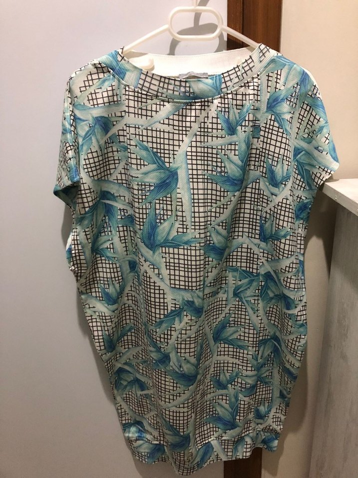 Turkuaz pastel baskılı, V yakalı, kısa kollu, bol kesim ve drapeli mini elbise , günlük kullanıma uygundur.