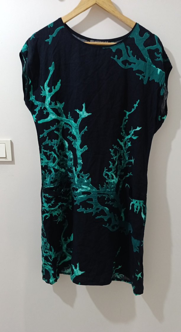 Yüksek yakalı, kısa kollu, bol kesim tunik elbise. Drapeli tasarım ve koyu turkuaz dış mekan kullanımı için uygun.hic kullanilmadi