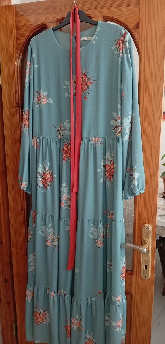 Turkuaz renkli, bol kesim, drapeli, askısız yakalı uzun elbise. Pastel çiçek desenli ve kuşaklı kollarıyla bohem tarzını yansıtır. boyu 142 cm kol 58 cm göğüs ölçüsü 56 cm dir eteğin uç kısmında defo var fotoğraf ta belirttim. boy ölçünüze göre kestirilip alınabilir