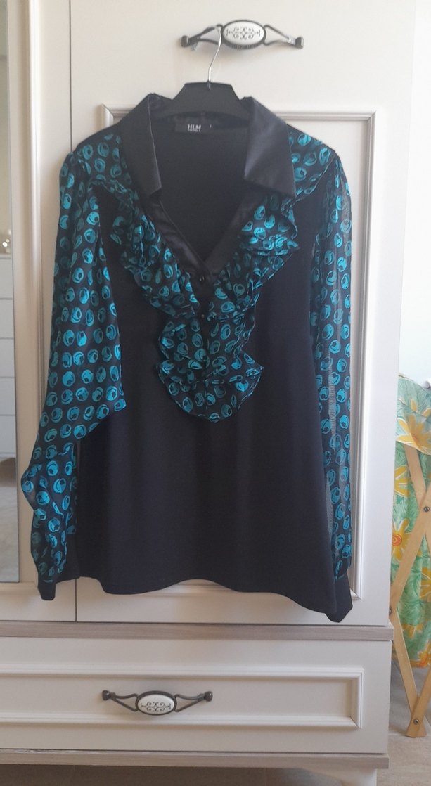 Turkuaz desenli, V yakalı ve düğmeli önlü, fırfırlı bluz. Uzun kollu, bol kesim, sentetik kumaştan, ofis için uygun.