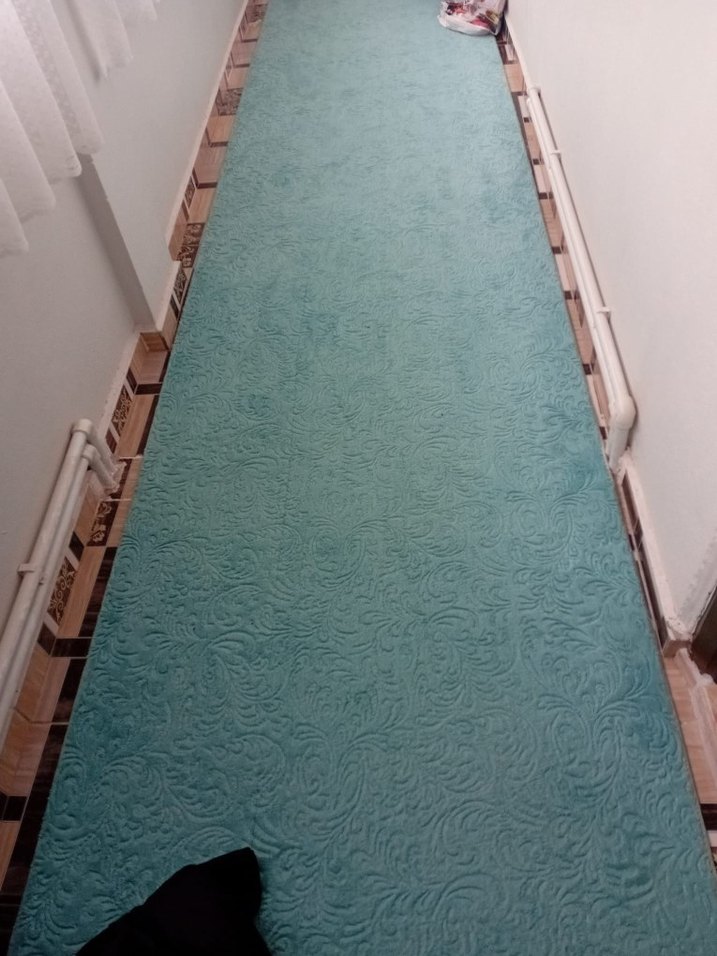 Açık turkuaz renkte, hafif kabartmalı desensiz klasik tarzda halı, dar alanlara yumuşak dokunuş sağlar.Uzunluğu 6.30 genişliği 1.00