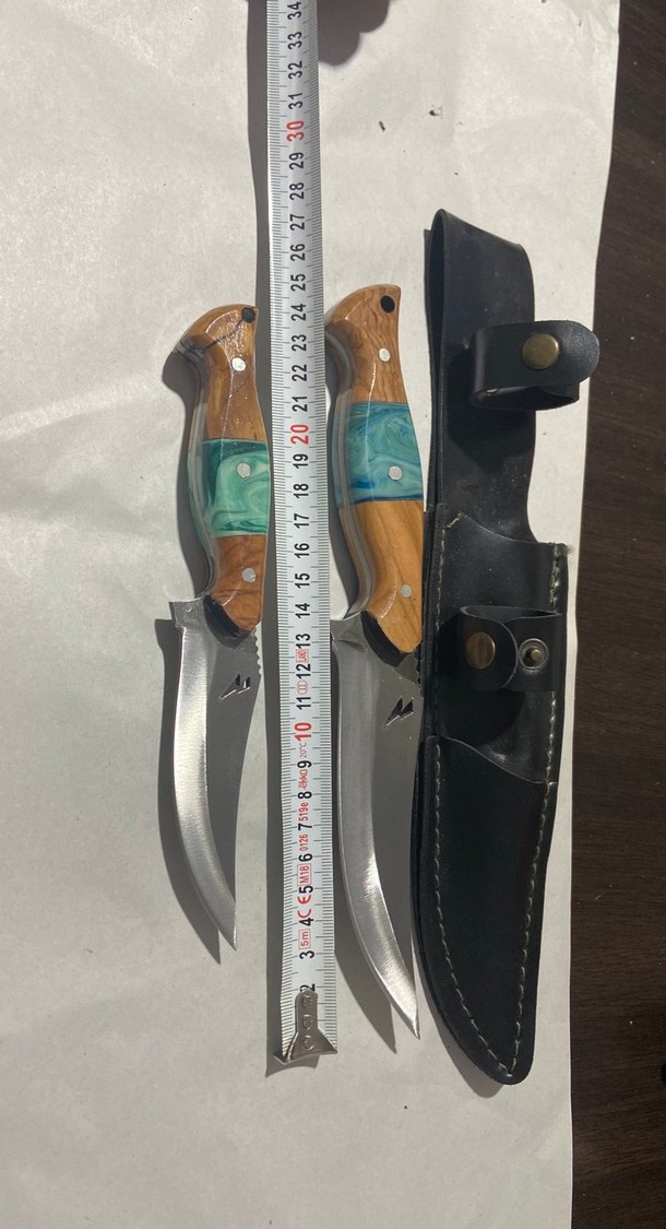 Ahşap saplarda turkuaz detaylar bulunan iki bıçak ve siyah deri kılıf seti.