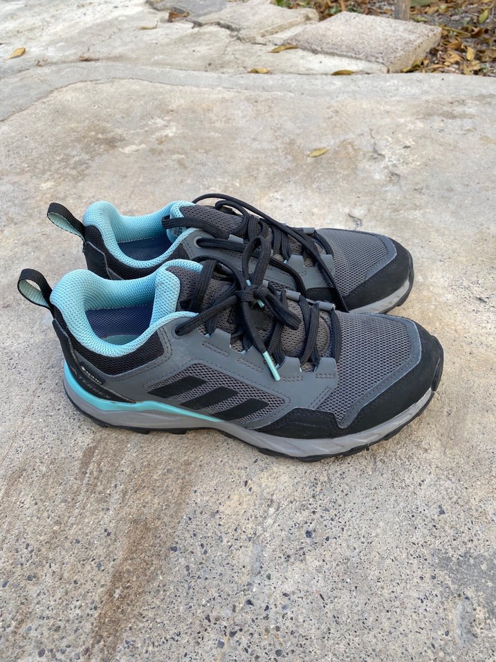 Gri ve turkuaz renkte, bağcıklı tasarıma ve kauçuk tabanlara sahip erkek outdoor ayakkabısı, sokak giyimine uygun.
