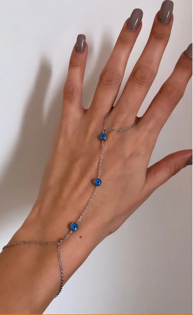 Bohem tarzda, turkuaz boncuk detaylı ince zincirli kadın el aksesuarı, günlük kullanıma uygun.