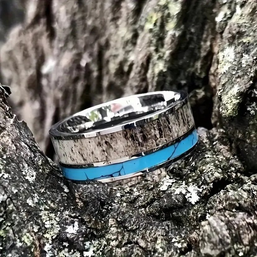 Turkuaz detaylı, gri dokulu bant üzerine minimalist tasarımlı erkek yüzüğü, bohem ve retro tarzını yansıtıyor.