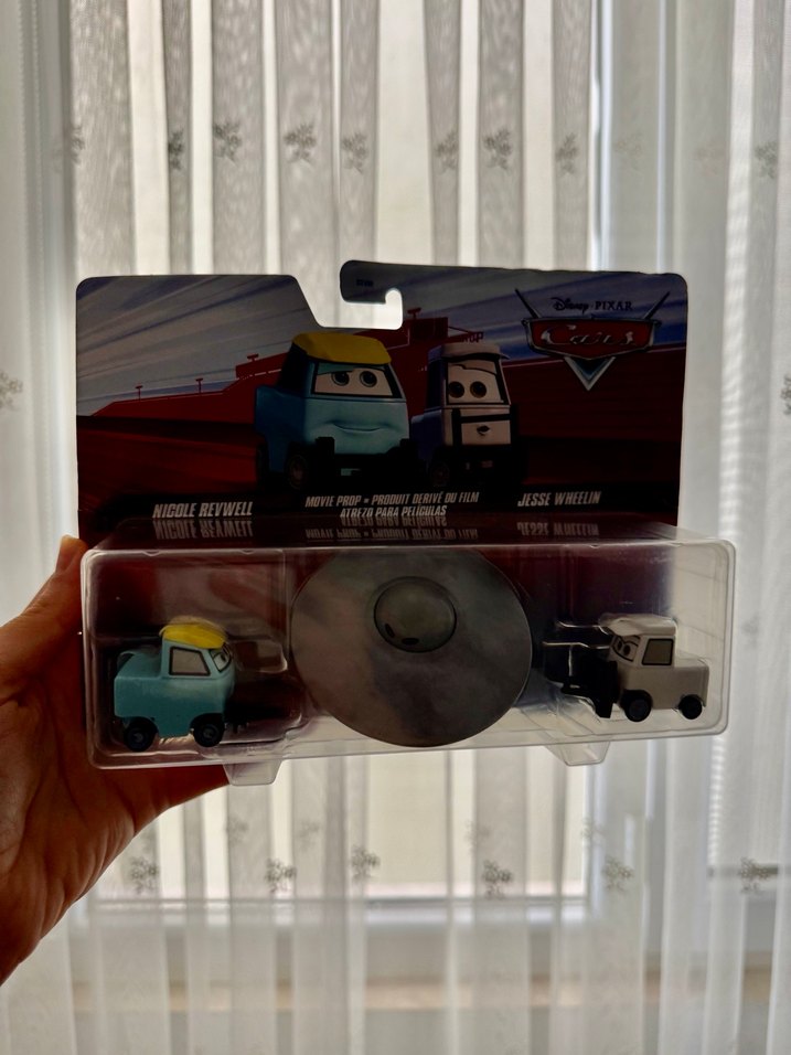 Disney Cars filminden esinlenen, turkuaz ve beyaz küçük oyuncak arabalar ile metalik disk aksesuar içeren set.