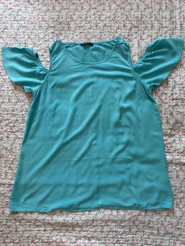 Yumuşak sentetik kumaştan, dökümlü tasarımlı turkuaz renkli kısa kollu bol kesim bluz. Rahat ve hamileler için uygun.