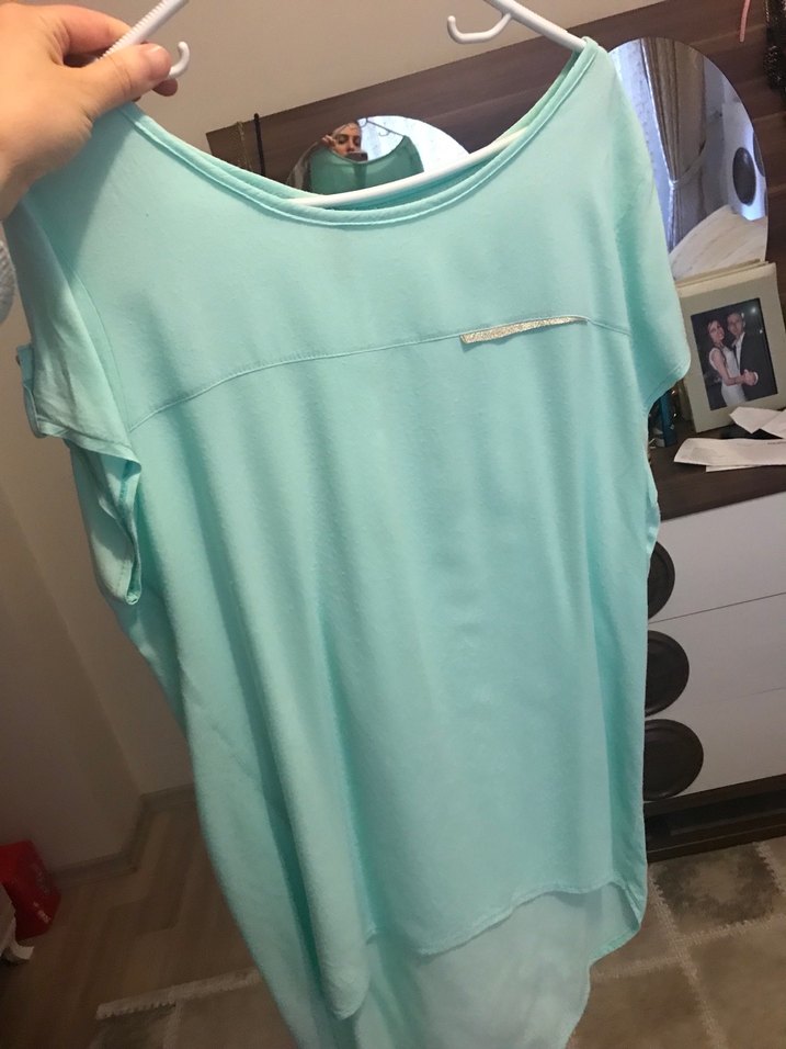 Turkuaz renkli, kısa kollu ve dökümlü yapısıyla rahat kesim kadın bluz. Yumuşak sentetik kumaştan üretilmiş, günlük kullanıma uygun şık bir parça.