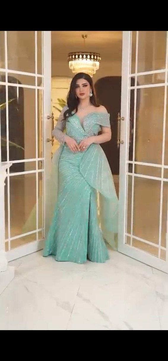 Turkuaz Drape İşlemeli Uzun Abiye Elbise