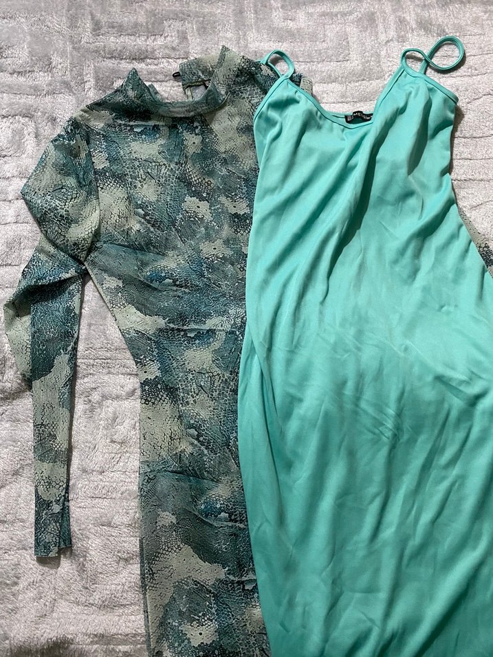 Turkuaz Drapeli Askılı Uzun Kadın Elbise 2li