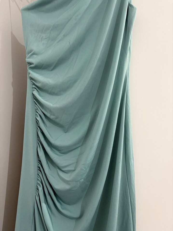 Turkuaz renkli, elbise, drapeli detaylarıyla şık bir görünüm sunar. Yumuşak sentetik kumaştan, minimalist ve çağdaş tarzda, düğünler için uygundur. Sadece 1 kez giyildi