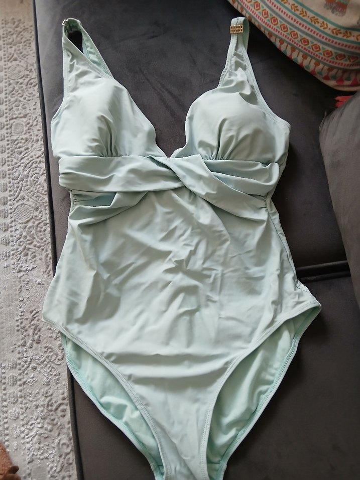 Turkuaz renkli, ince askılı ve drapeli tasarıma sahip kadın mayo, plaj için uygun, vücuda oturan ve minimalist bir görünüme sahiptir.