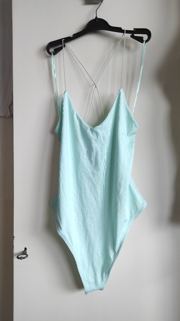 Turkuaz renkte, drapeli ve ipli askılı uzun kesim, vücuda oturan bohem tarzda kadın mayo. Desensiz ve plaj için uygun. #bluz #mayo #çıtçıtlı #suyeşili #bluz #gömlek