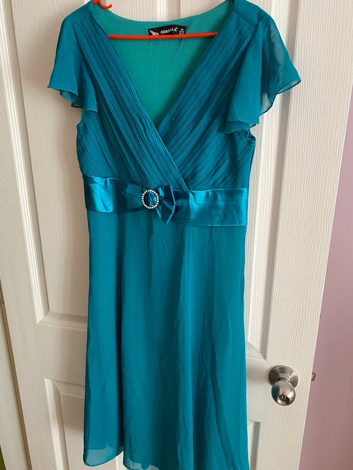 Turkuaz renkli, V yakalı ve kısa kollu midi boy drapeli abiye elbise. Fitted kesim, parlak kemer ve tokasıyla düğün için uygun.