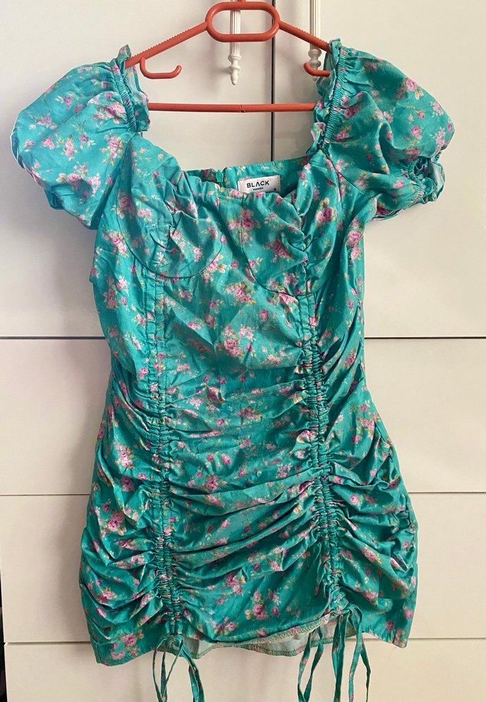 Turkuaz renkte, drapeli ve v yakalı, kısa ve dar kesim mini elbise. Askılı kollara ve tie-dye desene sahip, romantik akşamlar için ideal.