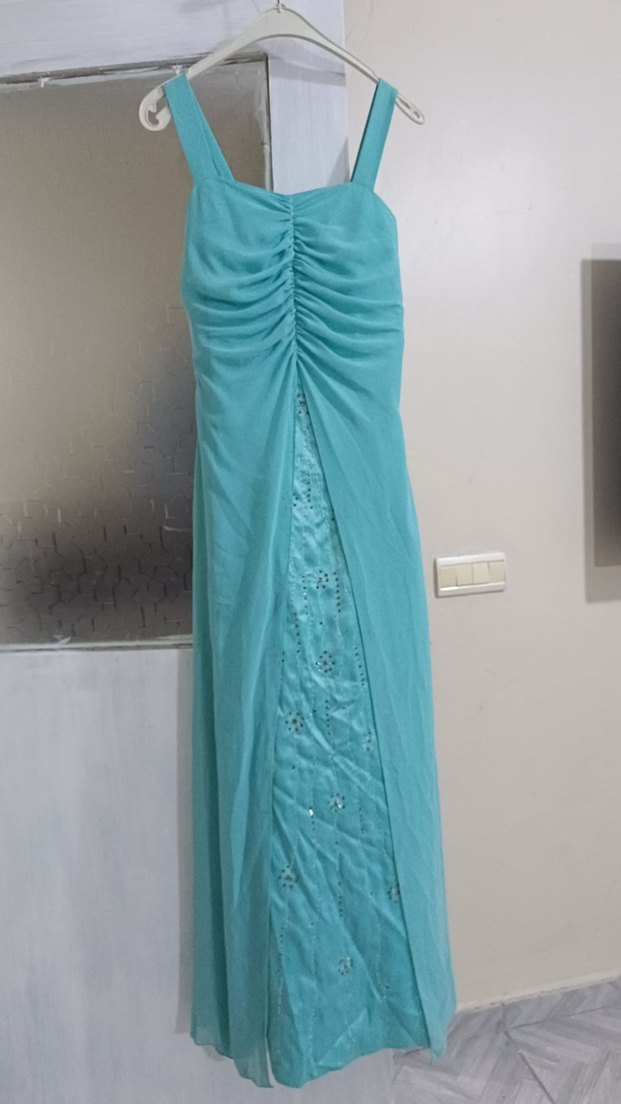 Turkuaz renkte, drapeli ve nakışlı uzun abiye elbise. Askılı, kolsuz ve bohem tarzda, düğünler için uygun klasik şıklıkta bir model.