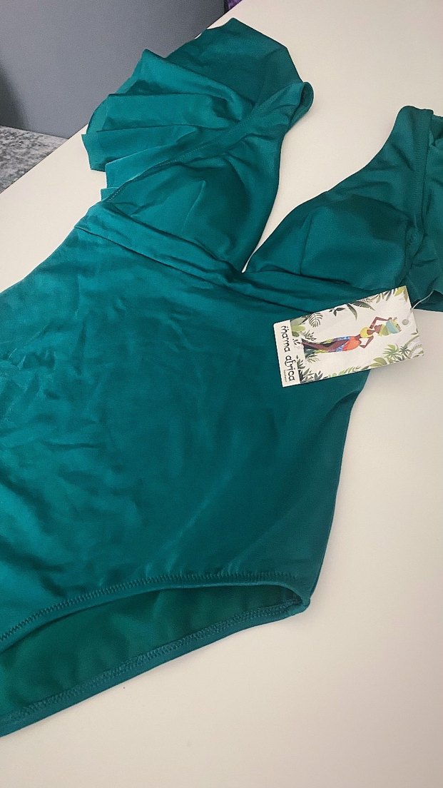 Turkuaz renkli, drapeli ve Volanlı kesime sahip, göğüs pedli bohem tarzda kadın mayo. Markası kallitesi efsane