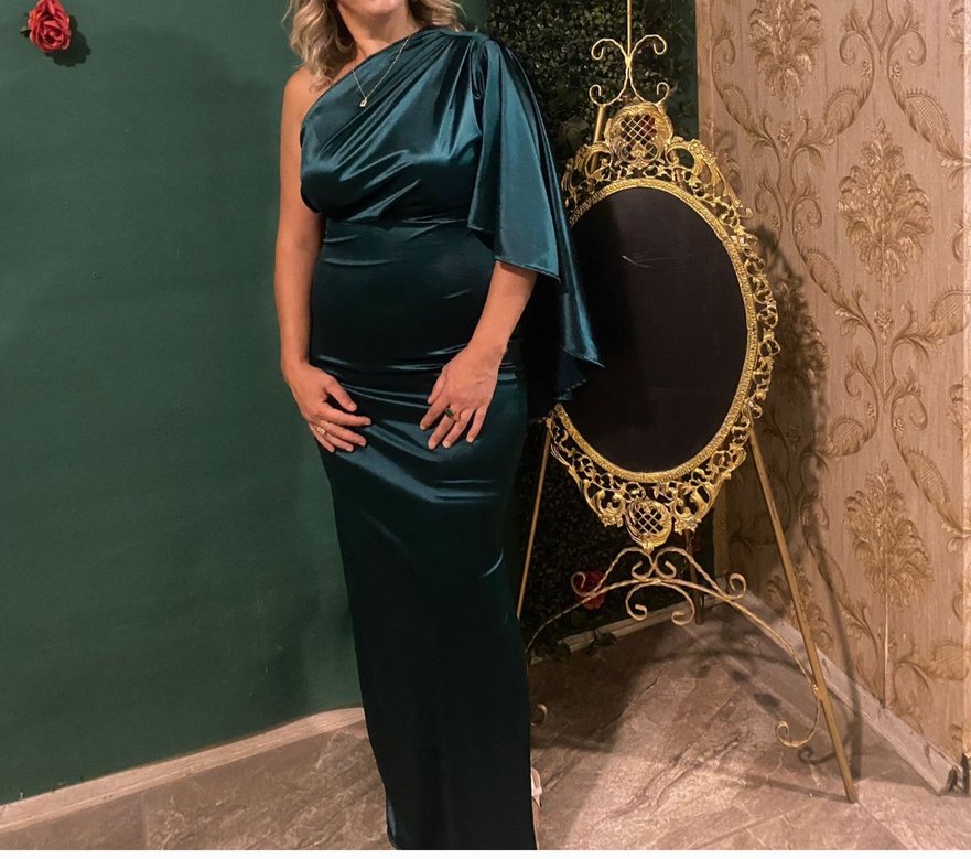 Fitted kesim, uzun abiye elbise parlak turkuaz kumaş ile drapeli, tek omuzlu yakaya sahiptir. Romantik akşamlar için çağdaş ve göz alıcı bir tasarımdır.