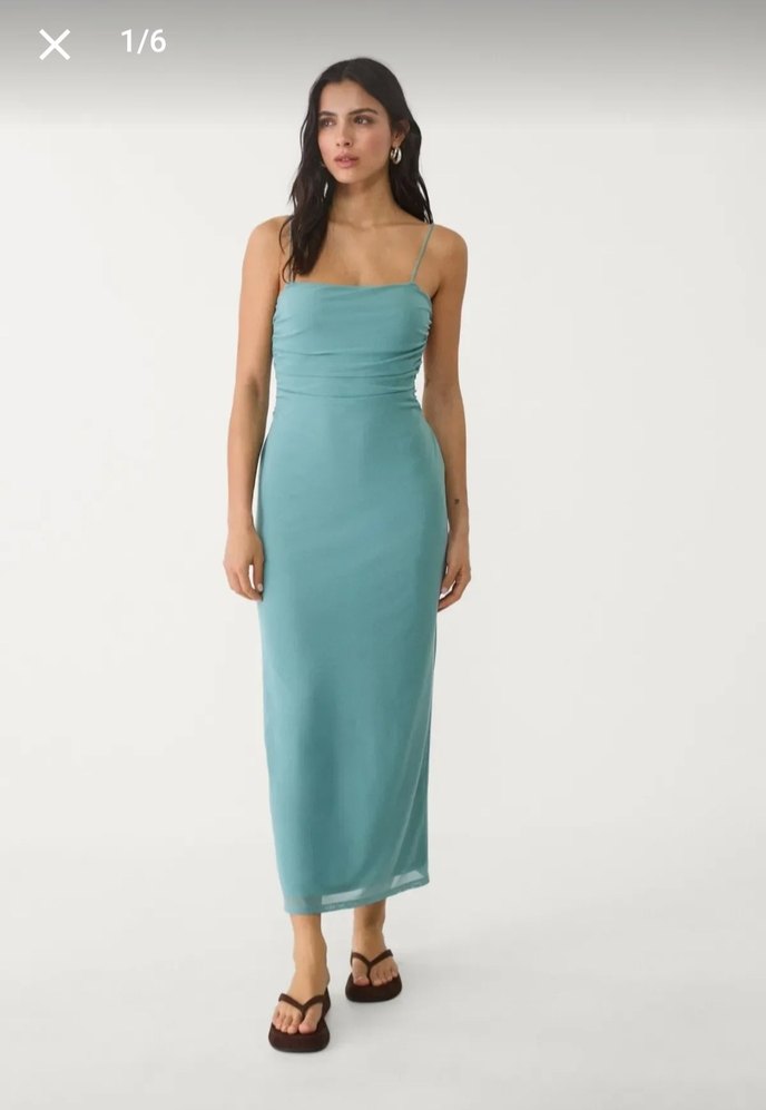 Turkuaz renkli, drapeli detaylı uzun abiye elbise. Straplez yakalı ve ince askılı, klasik ve modern minimalist tarzı yansıtıyor. Düğünler için uygun.