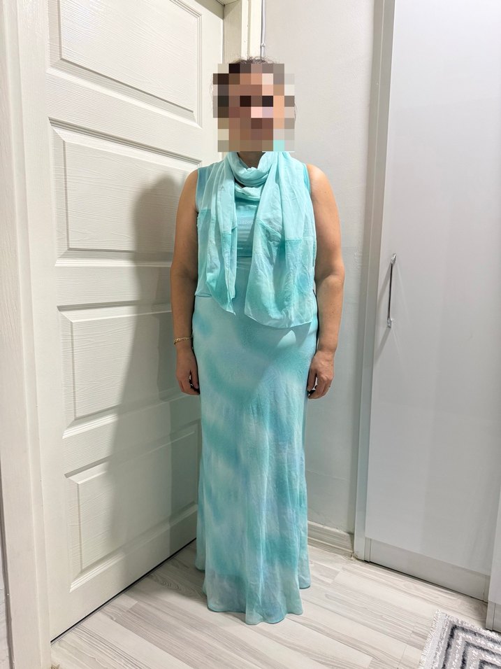 Uzun, vücuda oturan bu abiye elbise, halter yaka ve drapeli tasarımıyla pastel turkuaz batik desene sahiptir.