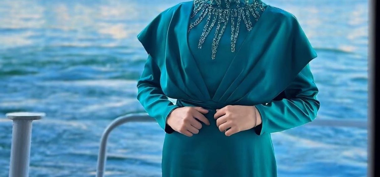 Drapeli ve işlemeli desenli, yüksek yakalı ve uzun kollu turkuaz renkli, parlak dokulu, uzun ve vücuda oturan abiye elbise. Pazarlıksız İade yok defosu yok