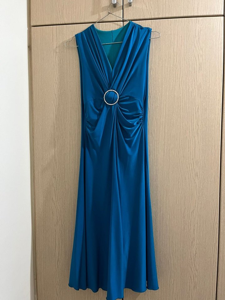 Kolsuz, V yakalı ve drapeli tasarıma sahip turkuaz uzun abiye elbise. Parlak kumaşı ve minimalist stili ile düğünler için uygundur. S M uyumlu bir kez giyildi