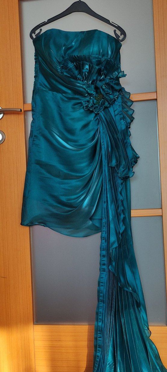 Drapeli, straplez ve vücuda oturan bu uzun abiye elbise, parlak turkuaz kumaş ve işlemeli detaylarla düğünler ve avangart tarz için uygundur.