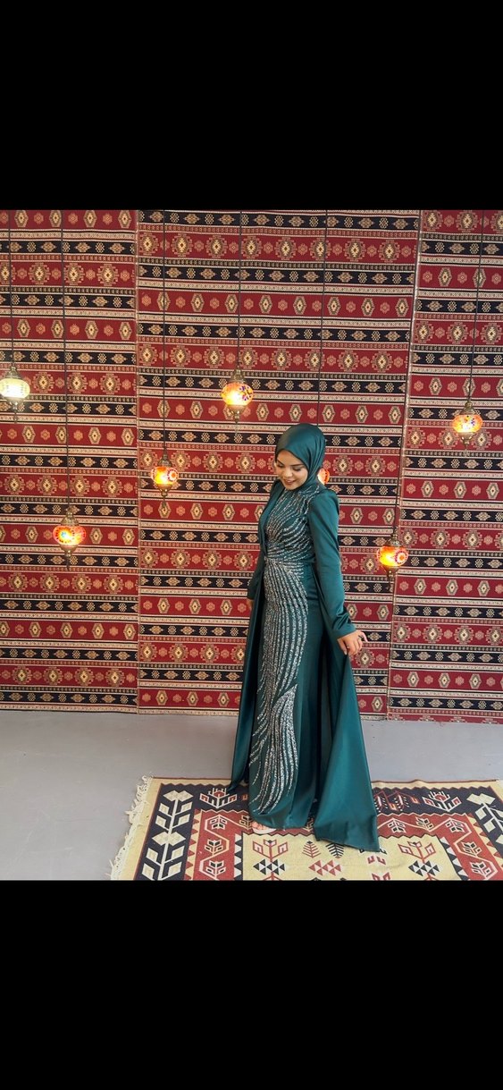 Turkuaz Drapeli Uzun Abiye Elbise