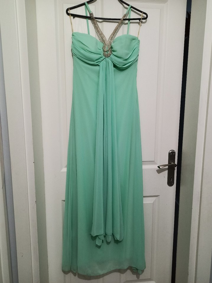 Turkuaz pastel tonlarında, drapeli ve straplez uzun abiye elbise. Klasik ve modern tarzda, düğün için uygun, vücuda oturan kesim.