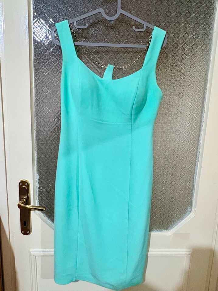 Turkuaz renkli, drapeli detaylara sahip uzun ve vücuda oturan kadın abiye elbisesi. Kolsuz, straplez yakası ile minimalist ve çağdaş bir tasarıma sahiptir. Parti için uygundur.