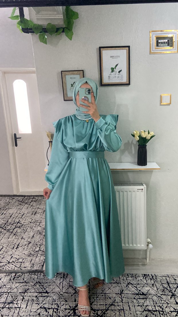 38-44 uyumlu beli lastikli Şalo dahil Turkuaz renkte, drapeli tasarıma sahip uzun ve salaş kadın elbise. Yüksek yakalı, uzun kollu ve ipeksi dokuludur, günlük kullanıma uygundur.