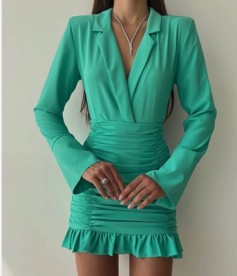 Turkuaz renkli, V yakalı ve uzun kollu, beli ve etek ucu drapeli, kısa ve dar kesim mini elbise. Ofis için uygun, çağdaş tarzda.
