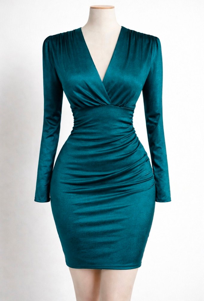 Parlak turkuaz kadife kumaştan, derin V yakalı ve uzun kollu bu dar kesim midi elbise, drapeli tasarımıyla modern ve göz alıcı bir şıklık sunar. pazarlık payı var yalnız bir defa giyildi hatasız defosuz yeni çok hafif çok şık bir elbise bende öğrenciyim yardımcı olurum fiyatta haki renk parlak kadife elbise s de olur m de vücudu sarar boyunu çekip uzatabilirsiniz