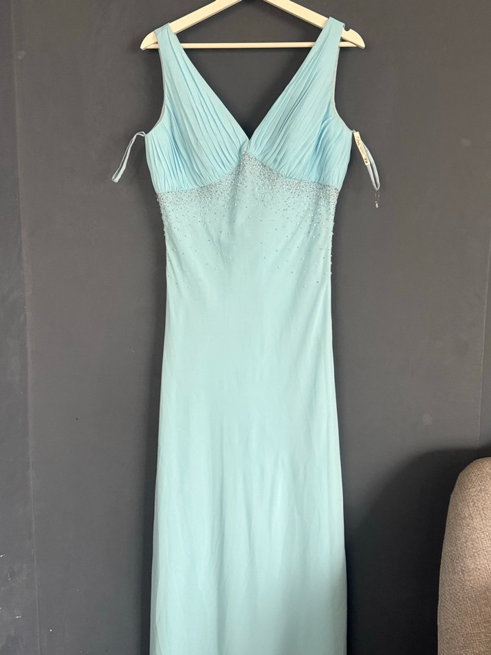 Drapeli V yakalı, kolsuz ve uzun kesime sahip turkuaz abiye elbise. Klasik ve gösterişli tarzda, düğünler için uygun.