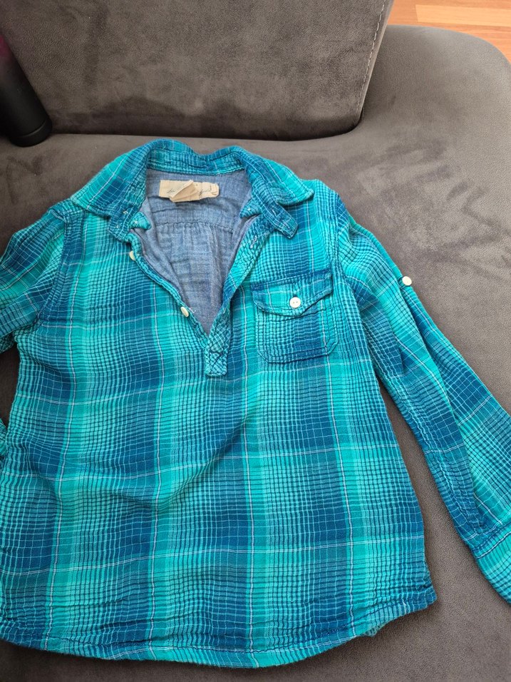 Turkuaz kareli, düğmeli ve uzun kollu çocuk gömleği, bol kesim ve yakalı tasarıma sahiptir. Rahat tekstil kumaştan yapılmıştır.